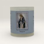 Vela religiosa presentada en vaso plástico común y práctica, ideal para uso diario.