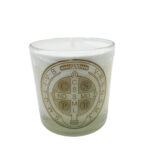 Vela blanca aromática en frasco de vidrio con tapa metálica dorada, decorada con la tradicional medalla de San Benito al frente. Ideal para acompañar momentos de oración, protección y armonización del hogar.