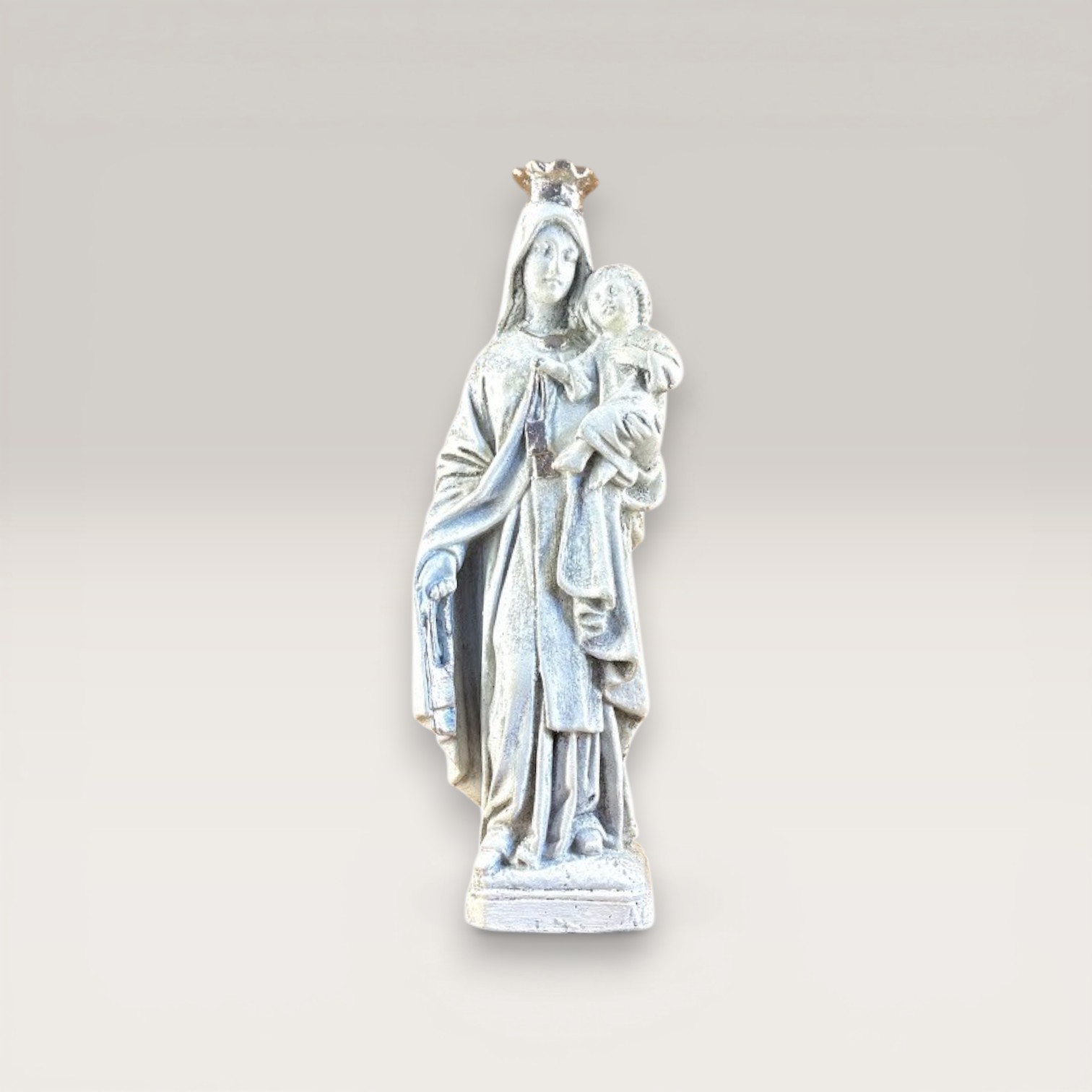 Esta pieza es una obra de arte sacro de fabricación nacional, elaborada por un artista especializado en arte sacro. Está realizada en cemento, lo que la hace una opción apta para exterior, ideal para colocar en grutas, jardines o altares al aire libre. La imagen tiene una altura de 30 cm y presenta un acabado artesanal que resalta los detalles de la Virgen y el Niño Jesús.