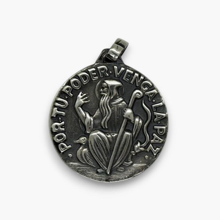 Medalla San Benito en plata 925Con un diseño de gran presencia gracias a sus 3 cm de diámetro, cuenta con un excelente nivel de detalle en relieve, que resalta cada inscripción y símbolo de la medalla. Además, está rodinado, lo que le aporta un brillo superior, mayor resistencia al desgaste y protección contra la oxidación, manteniéndose impecable por más tiempo.