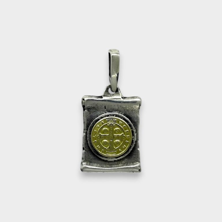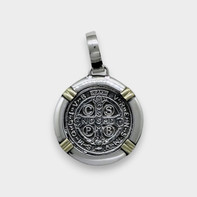 La Medalla de San Benito es mucho más que un objeto de devoción; es un poderoso símbolo de fe y protección que nos recuerda la presencia constante de Dios en nuestra vida. Llevar esta medalla es una forma de honrar el legado de San Benito, cuya vida fue un testimonio de oración y trabajo.Esta medalla circular está fabricada en plata 925 de primera calidad y se distingue por sus elegantes detalles en oro que resaltan el contorno de la pieza. Presenta la tradicional Cruz de San Benito en el frente y la figura del Santo en el dorso, lo que la convierte en una medalla de gran valor simbólico y durabilidad, ideal para usar como protección diaria en una cadena o para obsequiar.