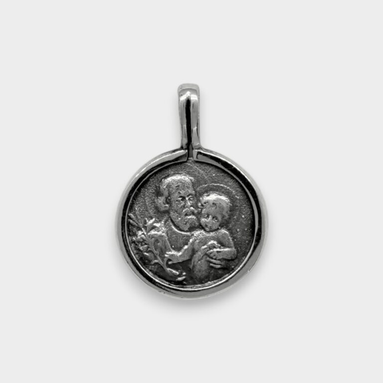 San José, custodio de la Sagrada Familia, representa el amor silencioso, la entrega y la fidelidad absoluta a la voluntad de Dios. Portar su medalla es una invitación a poner bajo su amparo nuestro hogar y nuestro trabajo.Esta medalla de formato circular está realizada íntegramente en plata 925, lo que garantiza una pieza de excelente calidad y brillo duradero. Presenta en su frente la imagen detallada de San José con el Niño Jesús y, en su parte posterior, el grabado del lirio, símbolo de su integridad y elección divina; es ideal para llevarla diariamente como un signo de protección laboral y familiar.