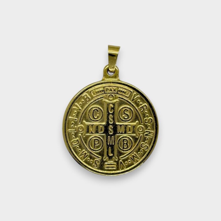 La Medalla de San Benito es mucho más que un objeto de devoción; es un poderoso símbolo de fe y protección que nos recuerda la presencia constante de Dios en nuestra vida. Llevar esta medalla es una forma de honrar el legado de San Benito, cuya vida fue un testimonio de oración y trabajo.Esta medalla de formato circular está confeccionada en acero quirúrgico con un acabado en color dorado. Presenta la tradicional Cruz de San Benito en el frente y la imagen detallada del Santo de cuerpo completo en su parte posterior