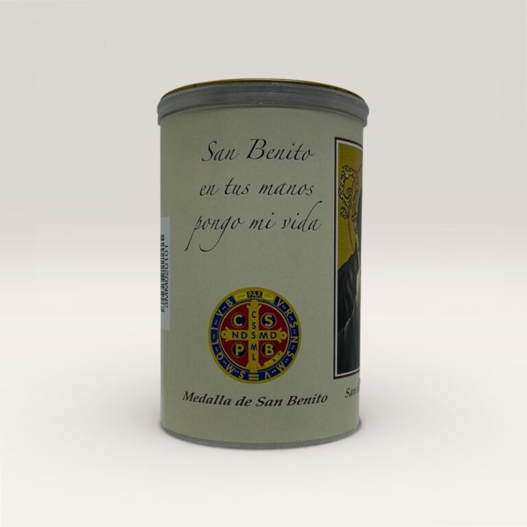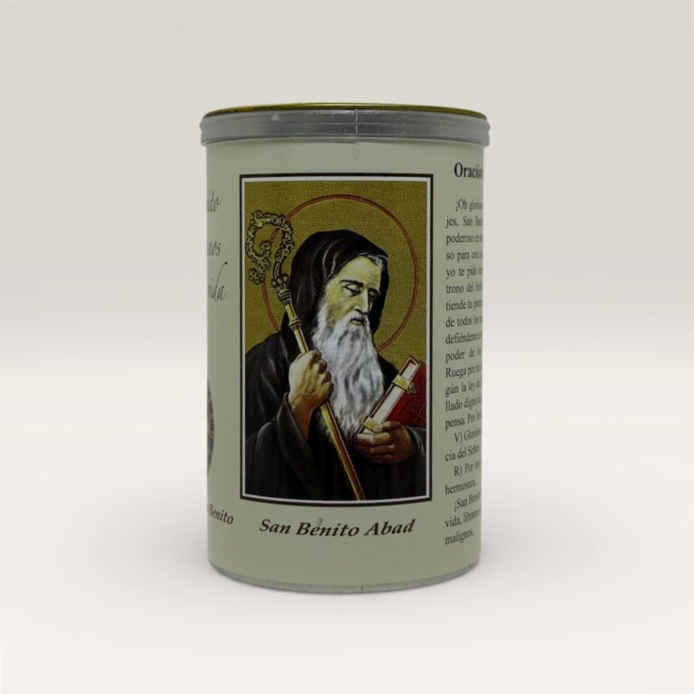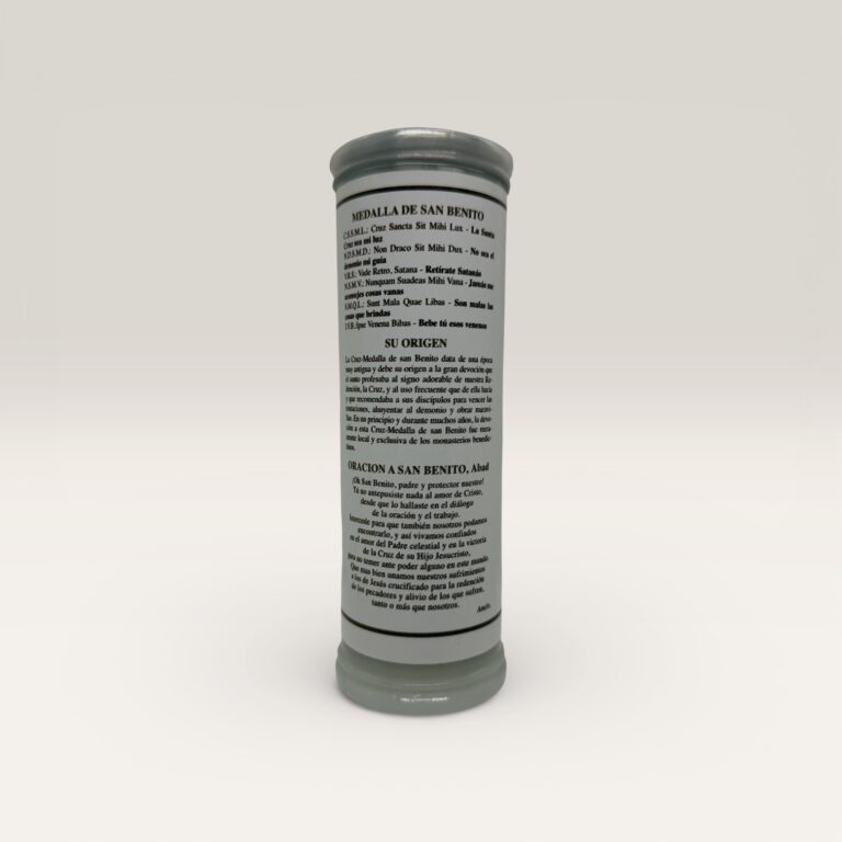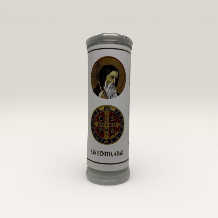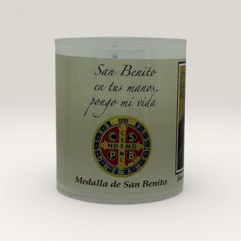 Vela blanca aromática en frasco de vidrio con tapa metálica dorada, decorada con la tradicional medalla de San Benito al frente. Ideal para acompañar momentos de oración, protección y armonización del hogar.