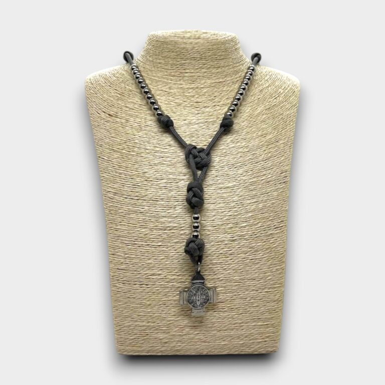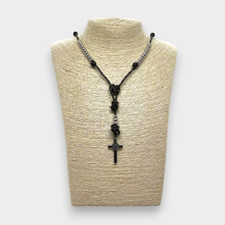 Su diseño es ajustable gracias a los nudos corredizos, lo que permite adaptarla cómodamente a distintas medidas de muñeca. Una opción práctica, resistente y con fuerte significado devocional.