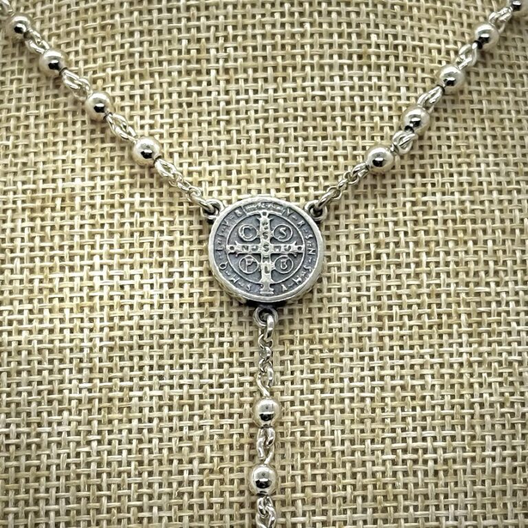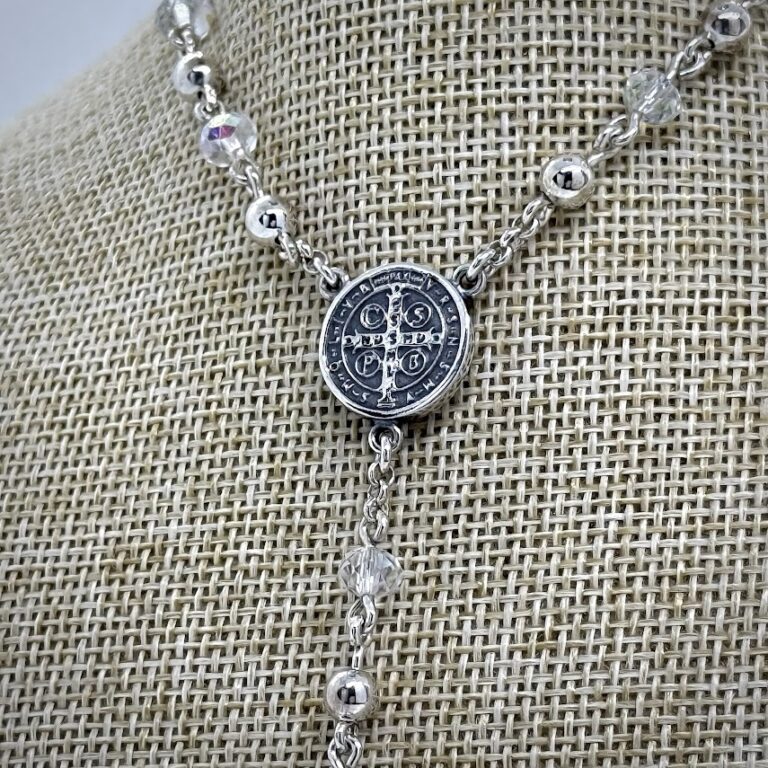 Rosario de plata 925 combinado con delicados cristales, que aportan brillo y elegancia a cada detalle. Se destaca la medalla de San Benito como centro y completa un fino crucifijo, conformando una pieza única.