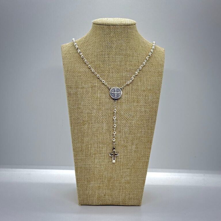 Rosario de plata 925 combinado con delicados cristales, que aportan brillo y elegancia a cada detalle. Se destaca la medalla de San Benito como centro y completa un fino crucifijo, conformando una pieza única.