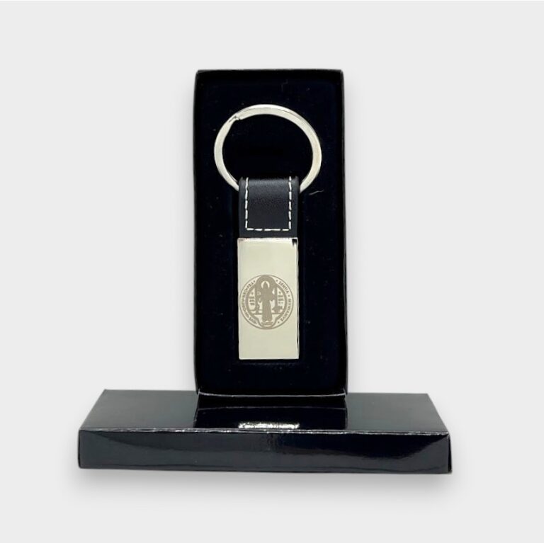 Llavero de acero quirúrgico con grabado láser de la medalla de San Benito, combinado con detalle en cuero que aporta un estilo elegante y moderno.