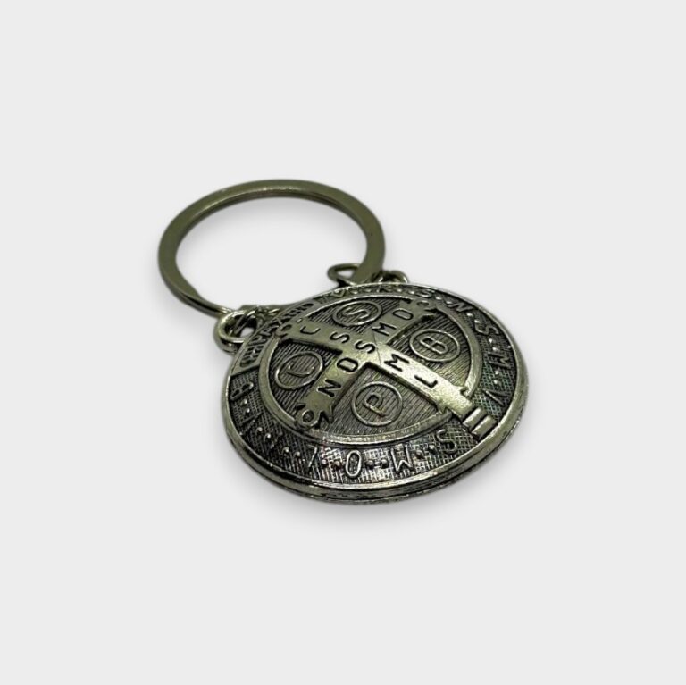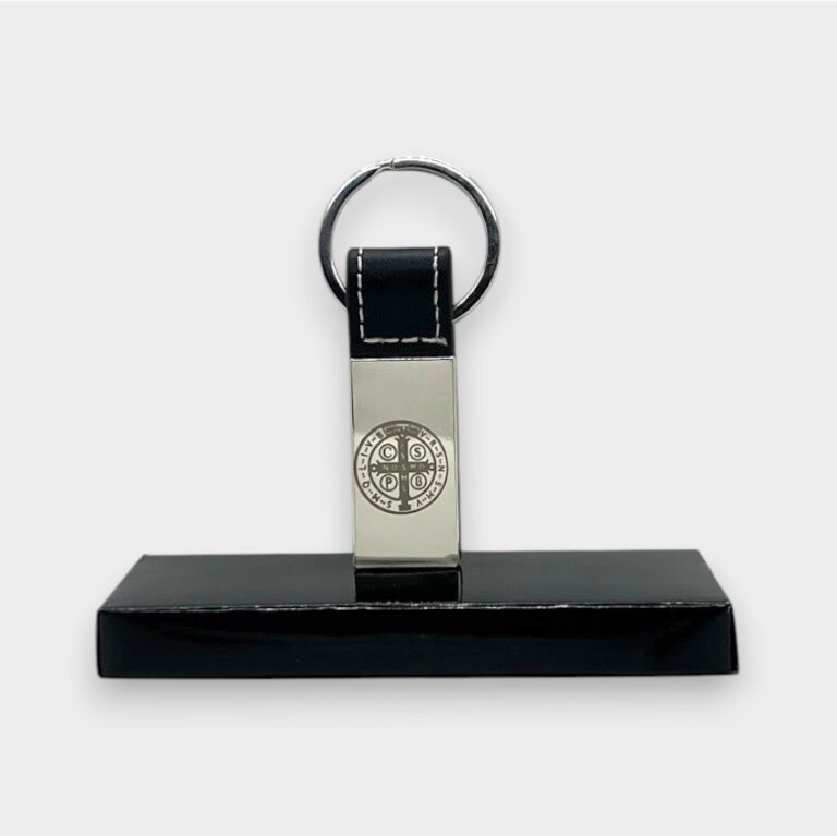 Llavero de acero quirúrgico con grabado láser de la medalla de San Benito, combinado con detalle en cuero que aporta un estilo elegante y moderno.