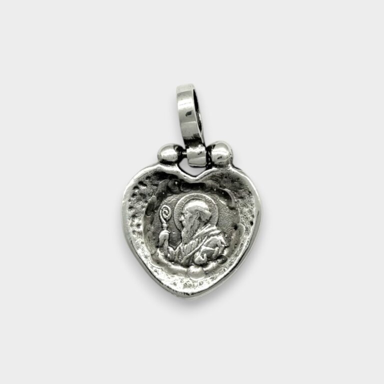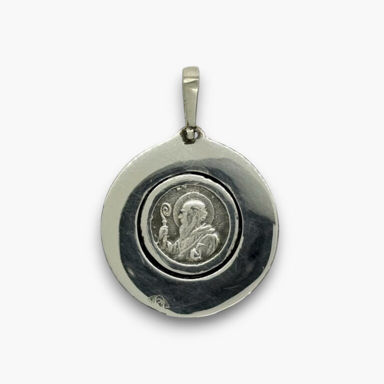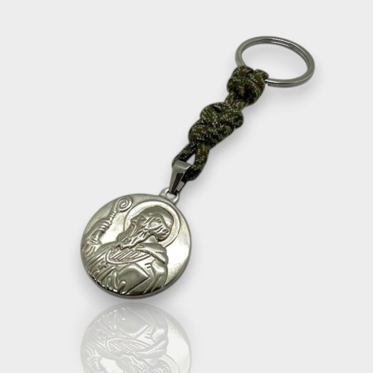 Llavero con medalla de San Benito realizada en acero quirúrgico, con excelente terminación en anverso y reverso, donde se aprecian claramente tanto los símbolos tradicionales como la imagen del santo.