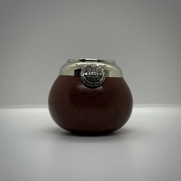 Elaborado en calabaza natural, recubierto en cuero y con borde en alpaca, que le aportan un estilo tradicional y elegante. Incluye la medalla de San Benito en la parte superior.