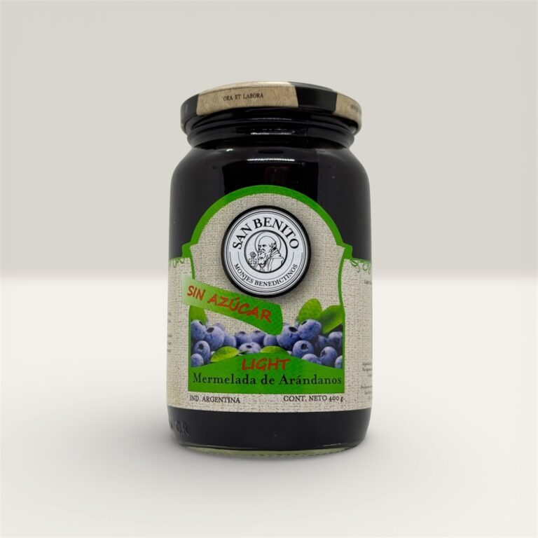 Mermelada de arándanos elaborada artesanalmente por los monjes benedictinos de la Abadía de Jauregui, Luján. Preparada siguiendo recetas tradicionales que conservan el sabor auténtico y la textura natural de la fruta.