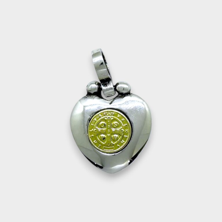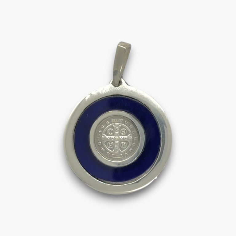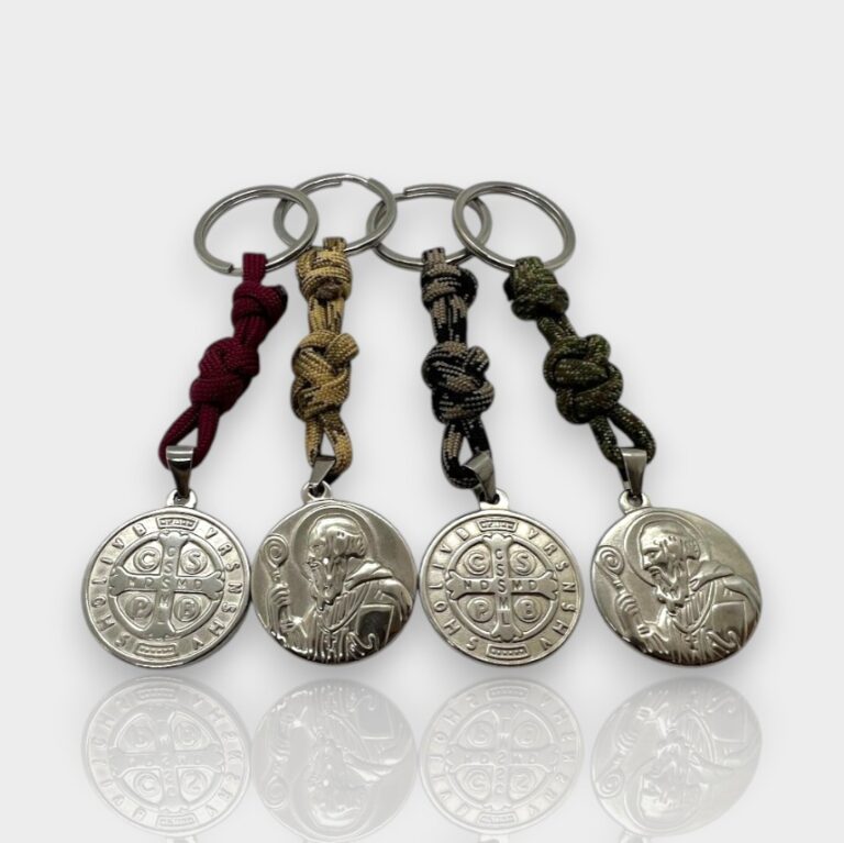 Llavero con medalla de San Benito realizada en acero quirúrgico, con excelente terminación en anverso y reverso, donde se aprecian claramente tanto los símbolos tradicionales como la imagen del santo.