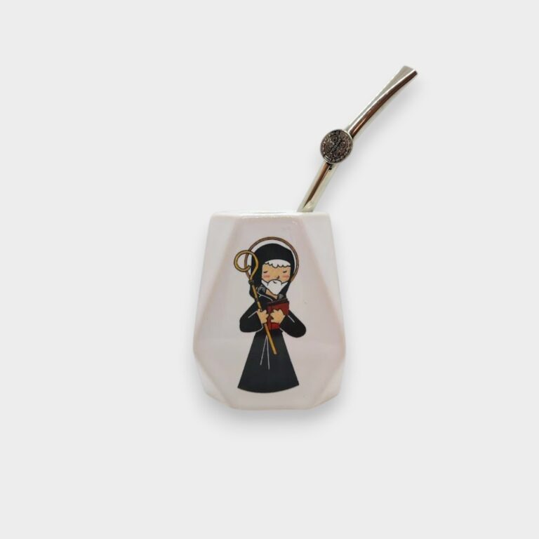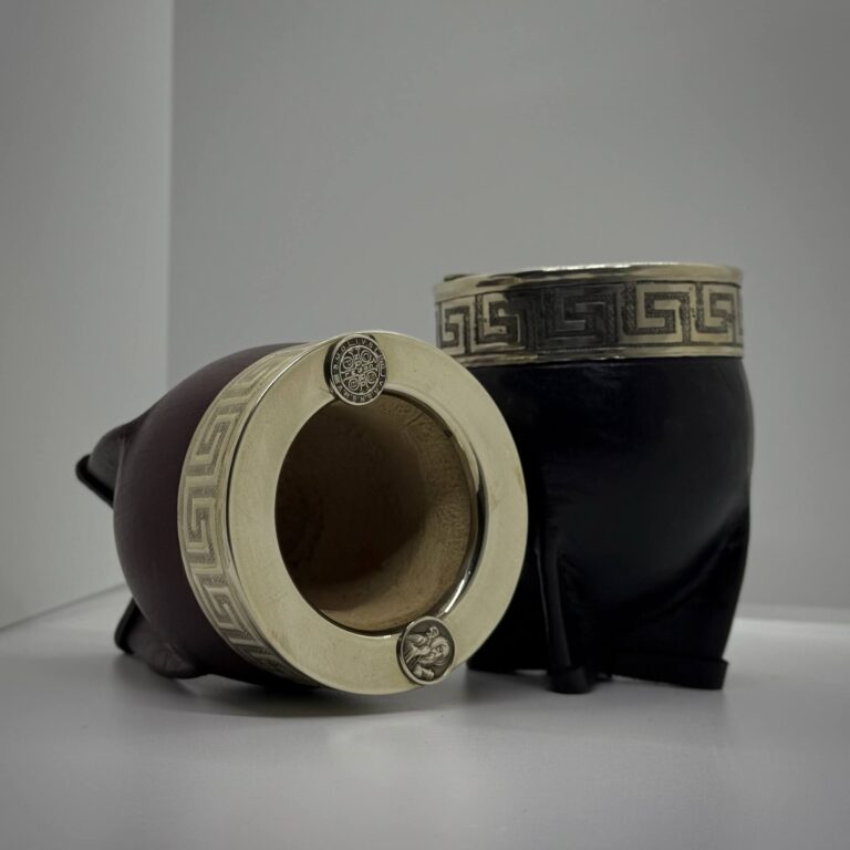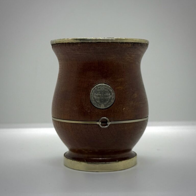 Elaborado en calabaza natural, recubierto en cuero y con borde en alpaca, que le aportan un estilo tradicional y elegante. Incluye la medalla de San Benito en la parte superior.